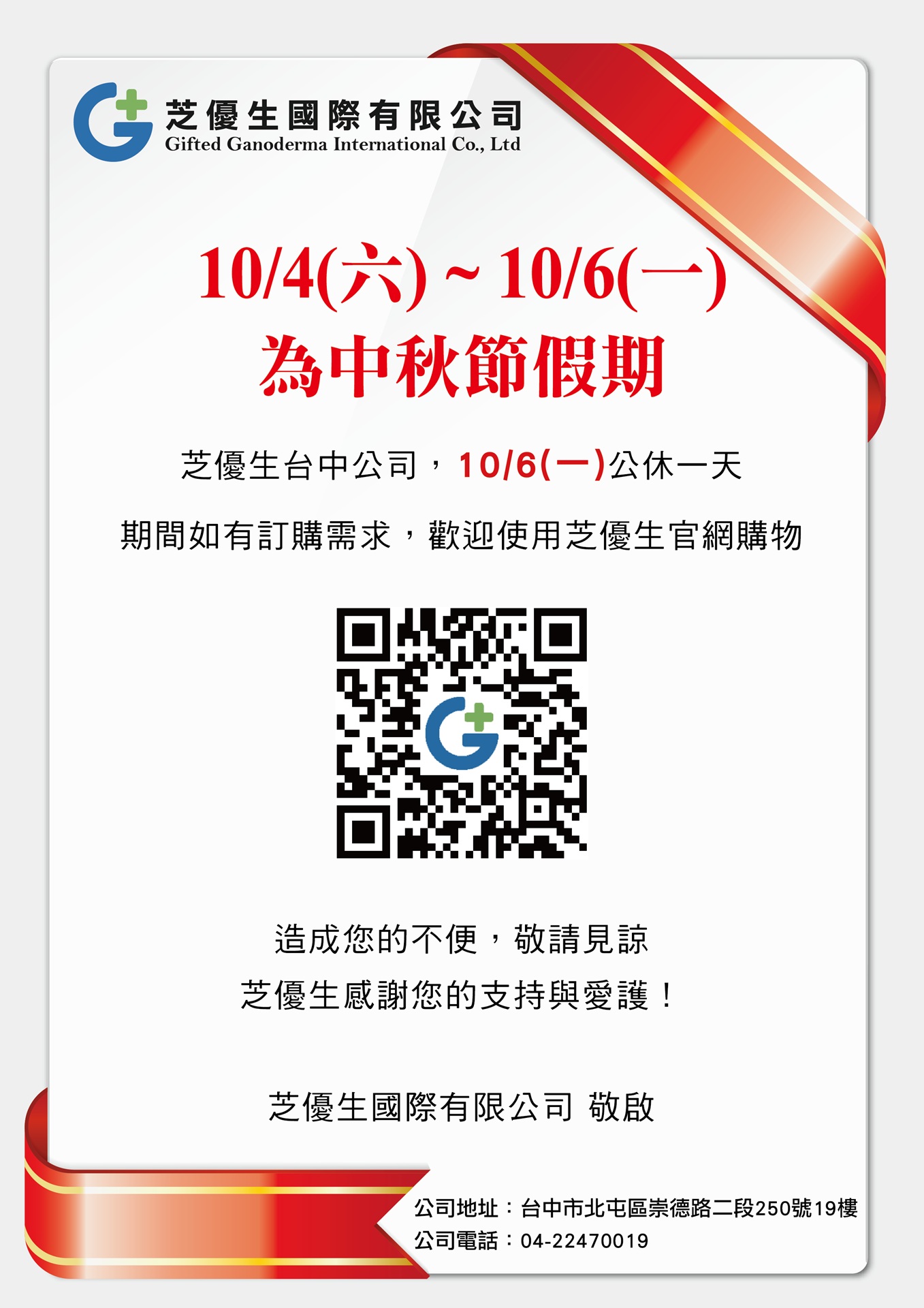 中秋節假期10/6(一)公休公告